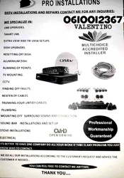 dish upgrades. Resetting off dish. Aluminium dish. Running of points. Tv mounting. Cctv. Finding off faults. Neaten of cables. Trunking your untidy cables. Plumbing. Mounting off surround sound and connection. Sound bar installations and set up